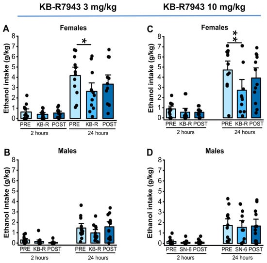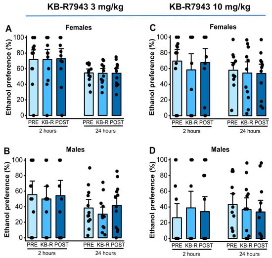We also analyzed the effects of KB-R7943 (3 or 10 mg/kg; p.o.) on ethanol preference measured at the 2nd and 24th hours after exposure to water and 7.5% ethanol. One-way RM ANOVA showed no statistical differences in ethanol preference in females (p = 0.93, Figure 4, panel A) and males (F2,22 = 5.06, p = 0.015, Figure 4, panel B) at the 2nd hour time point with a dose of 3 mg/kg KB-R7943. No statistical differences were also observed in ethanol preference at the 24th hour time point in females (p = 0.91, Figure 4, panel A) and males (p = 0.32, Figure 4, panel B). After the administration of 10 mg/kg KB-R7943, no statistical differences in ethanol preference were found in either females or males 2 h after exposure to water and 7.5% ethanol (female: p = 0.60, panel C, and male: p = 0.65, Figure 4, panel D). There were also no statistical differences in ethanol preference found in females (p = 0.75, Figure 4, panel C) and males (p = 0.68, Figure 4, panel D) 24 h after exposure to water and 7.5% ethanol.