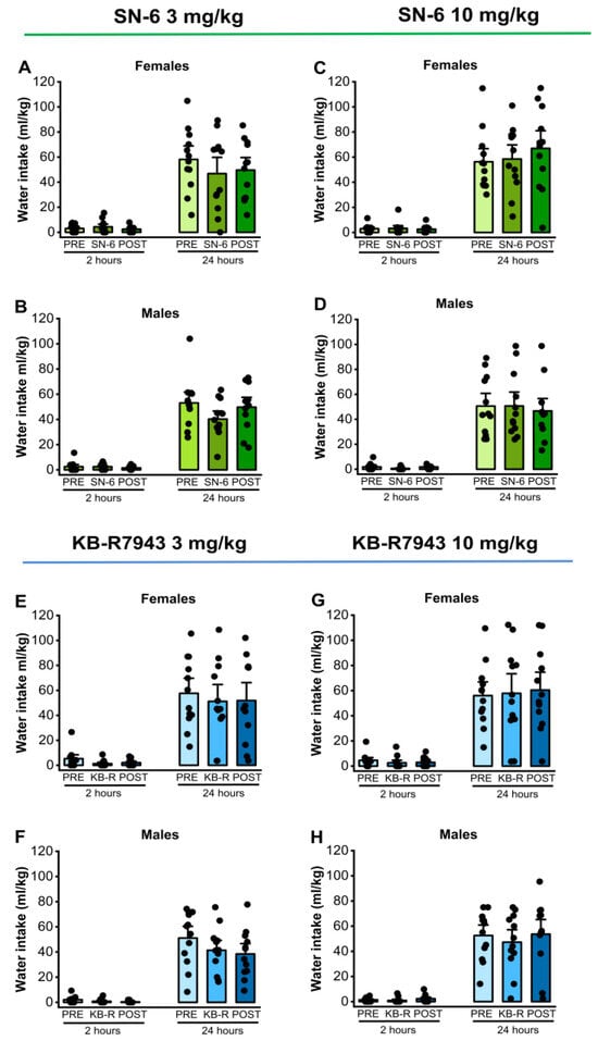 We analyzed the effects of two doses of SN-6 (3 or 10 mg/kg, p.o.) or KB-R7943 (3 or 10 mg/kg, p.o.) on water preference in male and female rats. Analysis showed that a 3 mg/kg dose of SN-6 did not affect water intake levels in females (p = 0.42; Figure 5, panel A) and males (p = 0.57, Figure 5, panel B) 2 h after exposure to water and 7.5% ethanol. Similarly, a 10 mg/kg dose of SN-6 did not cause any statistical difference in water intake levels in females (p = 0.16; Figure 5, panel C) and males (p = 0.76, Figure 5, panel D) 2 h after exposure to water and 7.5% ethanol. Additionally, there were no statistical differences in water intake levels 24 h after exposure to water and 7.5% ethanol under both 3 mg/kg SN-6 (female: p = 0.49, and male: p = 0.08, Figure 5, panels A,B) and 10 mg/kg SN-6 (male: p = 0.76, and female: p = 0.22, Figure 5, panels C,D). Quantification also showed that KB-R7943 administration at the dose of 3 mg/kg (p.o.) did not change water intake levels 2 h after exposure to water and 7.5% ethanol among both females (p = 0.07; Figure 5, panel E) and males (p = 0.06, Figure 5, panel F). Similarly, there were no statistical differences in water intake levels 2 h after water and 7.5% ethanol exposure under 10 mg/kg (p.o.) KB-R7943 in females (p = 0.88; Figure 5, panel G) and males (p = 0.77, Figure 5, panel H). Additionally, there were no statistical differences in water intake levels 24 h after water and 7.5% ethanol exposure under 3 mg/kg KB-R7943 in both females (p = 0.65; Figure 5, panel E) and males (p = 0.08, Figure 5, panel F) or 10 mg/kg KB-R7943 in both females (p = 0.93; Figure 5, panel G) and males (p = 0.77, Figure 5, panel H).