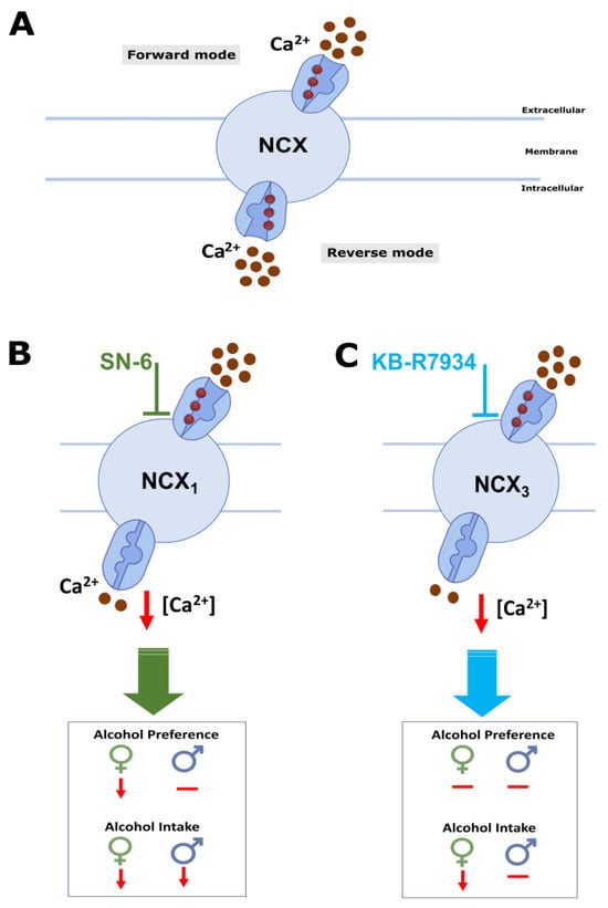 Summary and putative mechanisms. NCX activity results in Ca2+ influx in reverse mode and Ca2+ efflux during forward mode (A). Administration of NCX reverse mode activity inhibitors (B,C) decreases intracellular [Ca2+] levels, reducing Ca2+-dependent mechanisms (and activating Na+-dependent mechanisms), potentially leading to decreased ethanol consumption and preference.