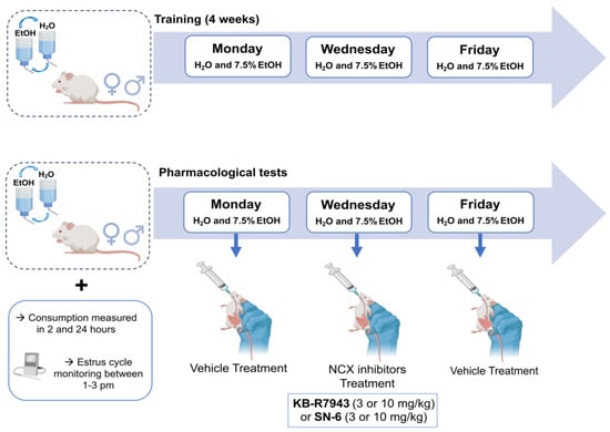 Experimental design. During the experiments, adult male and female rats were given a choice between water and 7.5% ethanol thrice a week (Mondays, Wednesdays, and Fridays) using a two-bottle choice paradigm. After four weeks of training, rats were given the vehicle (control solution) on Mondays, SN-6 or KB-R7943 on Wednesdays, and the vehicle (washout solution) on Fridays.