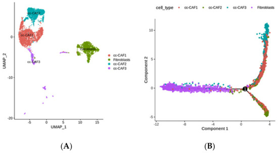 Cancer-associated fibroblasts (CAFs), which are widely present in tumor cells and more than 50% of stromal cells, are a group of activated fibroblasts that can secrete a variety of active factors to regulate the occurrence, development, and metastasis of tumors [38]. Four subtypes of CAFs were identified in ccRCCs: three different CAF subclusters and one fibroblast cluster (Figure 5A). Moreover, a trajectory analysis revealed that the fibroblasts were at an early stage of development, while the CAF-3 and CAF-2 cells were differentiated into two groups (Figure 5B) with different transcriptional characteristics (Figure S3).