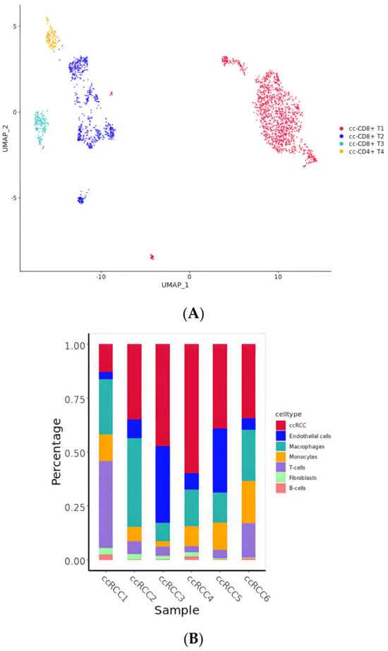 A Seurat object with gene expression data was imported into the Seurat (v2.3.0) R toolkit with the Read 10× function [25]. The normalizeData function in the Seurat package of the R toolkit, version 5.0.1, was used to normalize its raw counts with the command LogNormalize. The cells were visualized through two-dimensional uniform manifold approximation and projection (UMAP) [68]. Cell type annotation was performed using reference-based annotation and the R package “Single R”. After dimension reduction for each dataset, single cells were annotated with known cell types using Single R and reference ccRCC marker genes [69].