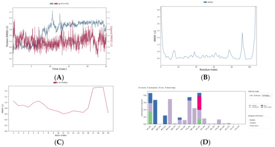 Molecular dynamics simulation results of FDA drugs flufenamic acid and fludarabine. (A–D) Flufenamic acid: root mean square deviation curve (RSMD), root mean square wave curve (RMSF), small molecule root mean square wave curve (RMSF), and statistics of interaction proportion of different residues. (E–H): The same metrics as above, but for fludarabine.