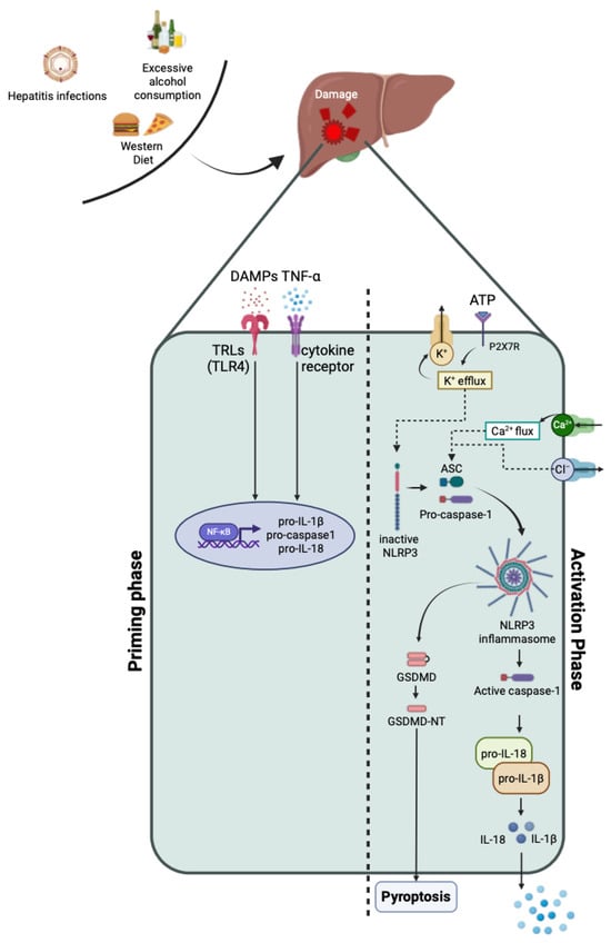 Alcohol-related liver disease (ALD) is one of the main common causes of liver diseases worldwide []. The less severe form of ALD is simple alcohol-related steatosis that can progress to alcohol-related steatohepatitis (ASH) and cirrhosis []. Alcohol addiction serves as a foundational element in the development of ALD, and NLRP3 appears to play a role in this context as well. Indeed, a study conducted by Li et al. demonstrated that NLRP3-knockout mice exhibit reduced binge alcohol intake and diminished anxiety-like behaviors during alcohol withdrawal compared to those observed in the control mice []. Other in vivo studies explored the effects of the IL-1 receptor antagonists in caspase-1, ASC, or type I IL-1β receptor- (IL-1R1) deficient mice, underlining the importance of IL-1β, a product of the NLRP3 inflammasome, in the onset of the inflammation of ALDs []. Inflammation and chronic alcohol consumption are strongly connected, since ethanol and its metabolites are the main promoters of hepatocyte necrosis. Upon binding to the P2X7 receptor on the KCs, ATP released from necrotic hepatocytes is responsible for K+ efflux and Ca2+ influx, which in turn activate the NLRP3 inflammasome.