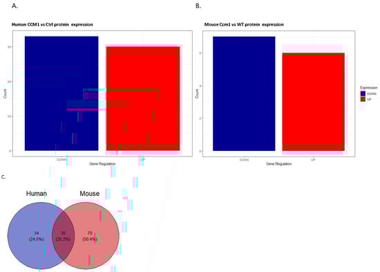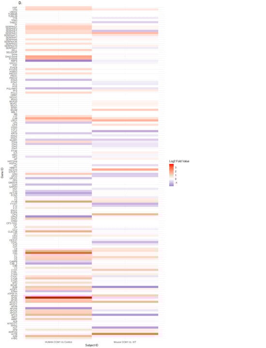 Differentially expressed serum proteins (DEPs) were identified in CCM1-deficient subjects and normal controls across species using high-throughput comparative proteomics. The statistical significance of differentially expressed serum proteins (DEPs) was determined by analyzing the distribution of expressed protein profiles. (A,B) Highly expressed serum proteins were distributed across species in CCM1-deficient subjects and normal controls. The distribution of DEPs was overlaid by comparing CCM1-deficient subjects to normal controls in both humans (A) and mice (B). Up- (red bar) and down- (blue bar) regulation were determined by fold change values. (C,D) Unique patterns in the DEPs were identified by comparing CCM1-deficient individuals and normal controls in two species. A Venn diagram displays unique and co-expressed proteins between humans and mice (C). Comparative heatmaps illustrate protein expression changes between CCM1-deficient subjects and controls in both species (D). The heatmaps display protein expression values for each related protein on the Y-axis. (E,F) Volcano plots display DEPs between CCM1-deficient subjects and healthy controls. This visualization highlights proteins in both control and confirmed CCM-deficient subjects, demonstrating how the differentiated protein expression varies compared to controls. A p-value, derived from a Student’s t-test, is shown in a −log10 function relative to the log2 fold change. This approach helps regulate infinite fold values for unique values, preventing graph distortion. The data points within the plot represent fold changes in protein expression for CCM1-deficient subjects compared to the control group in both humans (E) and mice (F). The values of up-and down-regulated proteins from figures (E,F) were refined using a −log10 p-value threshold to identify more significant results. For specific gene/protein names corresponding to the dots in the plot, please refer to Supplementary Figure S1E,F.