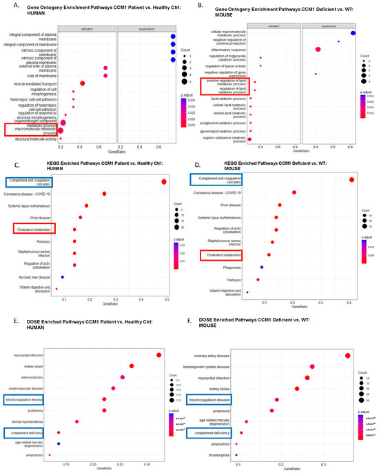 The GO enrichment pathway analysis showed that human and mouse CCM1-deficient subjects shared metabolic processes and pathways compared to the respective control groups (Figure 2A,B). In contrast, the GO-based over-enrichment analysis identified shared coagulation and complement pathways in CCM1-deficient subjects relative to the control groups in both humans (Table 1A, Supplementary Figures S3A and S4A) and mice (Table 1B, Supplementary Figures S3B and S4B). These differences could be attributed to each method’s distinct bioinformatics approaches and databases.