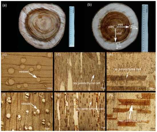 The microstructure of heartwood was observed from the cross-section, radial section, and tangent section and compared between SR14 and SR25 clones. Note, (a,b) belongs to the polished cores at DBH of SR14 and SR25, respectively, (c–e) and (f–h) belong to the heartwood of SR14 and SR25 observed under the microscope from cross-section, radial section, and tangent section, respectively. Scale bars = 10 µm.