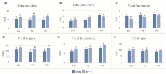 Determination of six compounds (starches, phenolics, flavonoids, sugars, and terpenoids) in SW, TZ, and HW of SR14 and SR25 clones. Note: (a–f) are the comparison of the contents of total starches, total phenolics, total flavonoids, total sugars, total terpenoids and total lignin among different clones,respectively. Data are presented as the mean ± SE. Different capital letters indicate that the treatment effect is significantly different at the p < 0.05 level. Lowercase letters and uppercase letters belong to clones SR25 and SR14, respectively.
