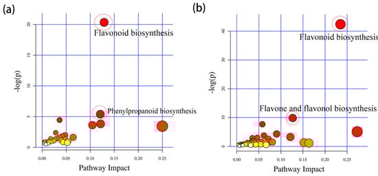 A multivariate statistical analysis showed that R2 and Q2 were higher than 0.5, indicating that the repeatability of the samples was good (Table S1). The metabolites in the sapwood and heartwood and those within the clones were divided into two groups in a PCA (Principal Component Analysis) (Figure S1), which indicated that there were differences in metabolite accumulation between the sapwood and heartwood of various clones. Among all of the differentially accumulated metabolites (DAMs), the number of metabolites identified in the positive-ion mode was higher than that identified in the negative-ion mode (Figure S2 and Table S1). Additionally, 2015 up-regulated and 1752 down-regulated metabolites were identified in the positive-ion mode in the sapwood of the two clones, and 1059 up-regulated and 2219 down-regulated metabolites were identified in the positive-ion mode in the transition zone of the two clones (Figure S2 and Table S1). The DEMs (differentially enriched metabolites) were further annotated using the Kyoto Encyclopedia of Genes and Genomes (KEGG) database. The results of the network diagram in heartwood between two clones showed that flavonoid biosynthesis and phenylpropanoid biosynthesis were the main significant enriched pathways (Figure 3a). In addition, the results for the sapwood between two clones showed that flavonoid biosynthesis, flavone, and flavonol biosynthesis were the main significant enriched pathways (Figure 3b).