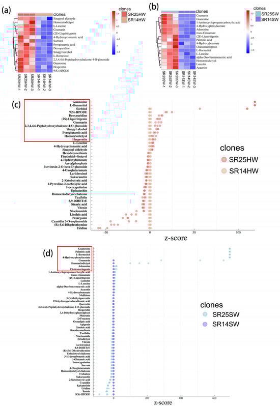 The analysis of cluster thermogram and Z-score (standard score) for differentially expressed metabolites in SR25HW vs. SR14HW and SR25SW vs. SR14SW groups for A. melanoxylon. Note, (a,c) belongs to the SR25HW vs. SR14HW group; figure (b,d) belongs to the SR25SW vs. SR14SW group. The deeper the color scale in the cluster diagrams of (a,b), the higher the accumulation level of differential metabolites which are significantly up-regulated or down-regulated. The metabolites in the red box are quite different.