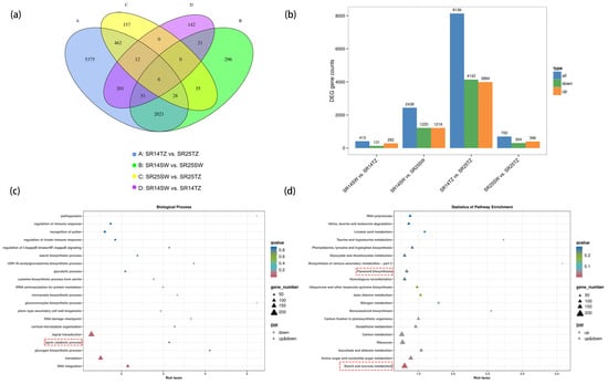 Transcriptomic analysis of differentially expressed genes in four comparison groups (SR14SW vs. SR14TZ, SR14SW vs. SR25SW, SR14TZ vs. SR25TZ, SR25SW vs. SR25TZ) of A. melanoxylon. (a) Venn diagram of DEGs in four comparison groups. (b) GO enrichment analysis of D.E.G.s. (c,d) The GO (the category of molecular function) and KEGG enrichment analysis of DEGs in SR14TZ vs. SR25TZ group, respectively. The pathway in the red box in the picture is our concern.