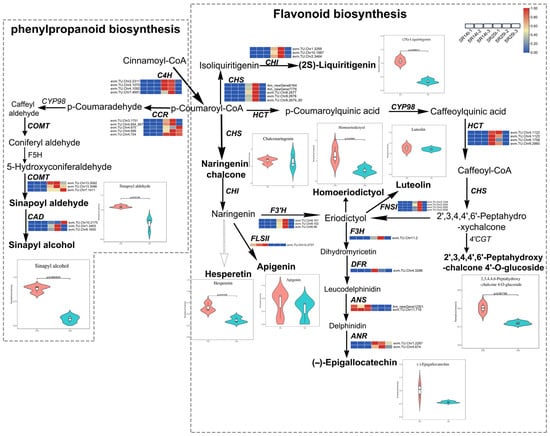 The results above indicate that the metabolites that exhibit significant differences primarily pertain to flavonoids. The outcomes of the DEGs from the KEGG and GO analyses further confirm the enrichment of the flavonoid biosynthesis pathway and lignin catabolic process in the transition zone of the two clones under investigation. Therefore, we combined the location distribution of differential metabolites and genes, focused on the flavonoid biosynthesis pathway, and drew a joint analysis diagram of genes and metabolites (Figure 6 and Table S5). Clustering heat maps were used to display the differential expression of the genes of the two clones, and violin plots were used to display the differential accumulation of metabolites.