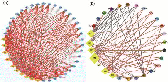 Correlation network diagram between TFs and metabolites in different clones of A. melanoxylon. Note: (a) shows the correlation between metabolites and all differentially expressed transcription factor families (|PCC| ≥ 0.8), and (b) shows differentially expressed genes and metabolites with significant correlation (p < 0.05 and |PCC| ≥ 0.8). The yellow diamond is a metabolite, and the circles of different colors are different TF. The yellow diamond size represents the number of TFs connected with it. The red line is positively correlated, the gray line is negatively correlated, and the line thickness represents the correlation. M1, 2′, 3, 4, 4′, 6′-peptahydroxychalcone 4′-O-glucoside; M2, Hesperetin; M3, Homoeriodictyol; M4, (2S)-Liquiritigenin; M5, Apigenin; M6, Luteolin; M7, Chalconaringenin; M8, (−)-Epigallocatechin; M9, Sinapoyl aldehyde; M10, Sinapyl alcohol.
