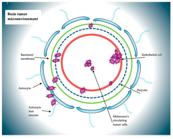 Astrocytes, in addition to playing a role in brain tissue homeostasis, in the maintenance of the BBB, and in the process of neuroinflammation, interact with metastatic melanocytic cells []. Astrocytes could protect melanoma CTCs from chemotherapy, and so by tumor cell apoptosis, sequestering cytoplasm calcium through direct functional gap junctions via connexin 43, but their role in facilitating brain colonization is unknown []. Astrocytes communicate with each other by producing cytokines that, in addition to exerting a paracrine effect, also influence metastatic cells, improving migration and invasiveness in the latter. This interaction is reciprocal: metastatic melanoma cells induce the production, by astrocytes, of pro-inflammatory factors such as IL-23, and on the other hand, factors such as MMP2 are produced. Klein et al., in their study, highlight how IL-23, through the expansion and maintenance of IL-17, keeps a chronic inflammatory state active and at the same time determines an overregulation of MMP2, important in metastatic invasion []. This inflammatory picture also demonstrates the presence of the so-called tumor-infiltrating immune cells made up of T lymphocytes, macrophages of B lymphocytes, plasma cells, mast cells, and natural killer (NK) cells []. T lymphocytes are composed of various subpopulations or activation states: cytotoxic T lymphocytes (CD8 coreceptor) can kill, like NK, the neoplastic cells, and the CD4 helper T lymphocytes act indirectly via cytokine secretion. From the perspective of antineoplastic activity, TH1 lymphocytes are the most important because of their role in activating TC lymphocytes, and the CD4-expressing T-cell subpopulation also comprises regulatory T lymphocytes playing a role in antigen tolerance and suppression of effector T lymphocytes []. In the melanoma brain metastasis, dense infiltration of CD3+/CD8 T cells and low levels of CD4 and NK cells increased their infiltration in the brain parenchyma []. Lymphocytic infiltrates are mostly located in the tumor’s peripheral area and the surrounding brain: CD8+ lymphocytes are usually observed in perivascular areas, and CD4+ and Treg lymphocytes are dispersed intratumorally []. This peculiar distribution of TIL is correlated with the areas with intense angiogenesis. Moran et al. have found fewer vessels but larger ones in the peripheral area than in multiples with small diameters in the core of the microenvironment []. This underlines a different way of angiogenesis where new vessels emerge from the vascular remodeling of large vessels by a process called nonsprouting angiogenesis or vascular co-option []. This phenomenon, which reflects an increased mean vascular density at the periphery of a tumor, is correlated with poor prognosis.