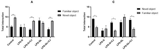 Tart cherry supplementation has been reported to improve working memory in aged rats []. In the present study, the administration of cherry juice improved the short- and long-term memory in the offspring of the LPS-G+CJ and LPS-GL+CJ groups according to NOR test. Several studies have reported that anthocyanins improve cognitive deficits in both animals and humans []. One study showed that consumption of anthocyanin-rich cherry juice improved memory in older adults []. It could be attributed to the neuroprotective effect of anthocyanins. A previous study showed that anthocyanins-rich blackberry juice administered to pregnant rats increased cell density in the dentate gyrus of the offspring. In the same way, blue corn tortillas administered during gestation rats increased the cell density in the dentate gyrus of the offspring [,]. Likewise, anthocyanins have been shown to increase synaptic plasticity, improving memory and learning after LPS infection in the cerebral cortex and hippocampus [].