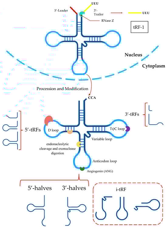 tRNAs undergo comprehensive processing and a series of chemical modifications throughout their life cycle. In eukaryotes, pre-tRNAs undergo ribonuclease P and ribonuclease Z cleavage of the 5′ leader and 3′ tail sequences, respectively [,]. The addition of the CCA tail is catalyzed by the CCA-adding enzyme (tRNA nucleotidyltransferase) []. This is accompanied by further modifications, ultimately leading to the formation of mature tRNA. The structure of mature tRNA is highly conserved and characterized by a distinctive configuration comprising four arms (stem and loop)—the D-arm, anticodon arm, TψC arm, and acceptor arm—as well as the variable arm at the connection of the anticodon arm and the TΨC arm [,]. Mature tRNAs or pre-tRNAs can be cleaved at specific positions by corresponding ribonucleases, thereby generating a diverse array of tRFs [,,]. tRNAs can generate five subtypes of tRFs, which are classified as follows: tRF-5 (5′-tRF), tRF-3 (3′-tRF), i-tRF, tRNA halves, and tRF-1. The former four types of tRFs are derived from mature tRNAs, and tRF-1s come from pre-tRNAs. The generation and classification of tRFs are shown in Figure 1.