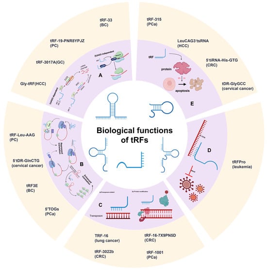 Functions of tRFs in diverse cancers. (A) RNA silencing; (B) translational regulation; (C) epigenetic regulation; (D) reverse-transcriptional regulation; and (E) cellular apoptosis.