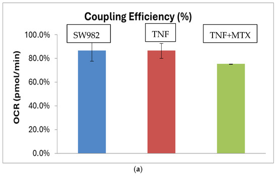 Legend (a): Results are presented as mean ± SD; Coupling efficiency % is the ATP production in %, normalized on the basal respiration. Blue—control SW982 cells (untreated, unstimulated), red—TNF-alpha-stimulated SW982 cells and TNF-alpha-stimulated SW982 cells, treated with MTX—1 µg/mL.