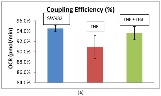 Legend (a): Results are presented as mean ± SD; Coupling efficiency % is the ATP production in %, normalized to the basal respiration; blue—control SW982 cells (untreated, unstimulated); and red—TNF-alpha-stimulated SW982 cells and TNF-alpha-stimulated SW982 cells, treated with TFB—100 nM.