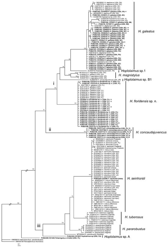 The D2–D3 expansion segments of 28S rRNA gene sequence alignment contained 131 sequences of Hoplolaimus, one sequence of P. christiei, and two Helicotylenchus sequences included as outgroups. The alignment length was 699 bp. The phylogenetic relationships within sequences of Hoplolaimus species are given in Figure 3. There are three major clades in the phylogenetic tree: (i) H. galeatus, H. magnistylus, H. floridensis sp. n., Hoplolaimus sp. 1 (USA), and Hoplolaimus sp. B1 (previously identified as H. concaudajuvencus, USA); (ii) H. concaudajuvencus; and (iii) H. seinhorsti, H. pararobustus, Hoplolaimus sp. A (USA, California), and H. tuberosus Mwesige, Maosa, Couvreur & Bert 2025 (Uganda). Sequences of the topotype Hoplolaimus galeatus population clustered with sequences of nematodes previously identified by other authors as H. stephanus. All these ‘H. stephanus’ sequences and other sequences of Hoplolaimus spp. clustered with sequences of the topotype H. galeatus population are considered here as representatives of H. galeatus. Sequences of the topotype H. stephanus population clustered with those of the topotype H. galeatus. Sequences of the lance nematodes from the Florida populations obtained in this study formed a clade with sequences of populations previously identified incorrectly as H. galeatus. All these sequences are considered representatives of a new species, H. floridensis sp. n. Sequences of the topotype H. concaudajuvencus population formed a separate clade within Hoplolaimus. Sequences of nematodes previously identified by some authors as H. concaudajuvencus are considered here as representatives of Hoplolaimus sp. B1. Sequences of H. seinhorsti from many countries around the world, including a new sequence from India obtained in this study, clustered with those of populations identified as H. columbus in South Carolina and southeastern states of the United States and those of populations identified as H. indicus from Iran, Morocco, and Myanmar. Sequences of populations of H. magnistylus from Ohio and Arkansas were distributed between two separate subclades. Sequences of H. pararobustus from Nigeria grouped in a separate clade. Maximal intraspecific sequence variations were for H. galeatus—1.6%, H. magnistylus—1.9%, H. floridensis sp. n.—0.2%, H. concaudajuvencus—0.4%, H. seinhorsti—0.7%, and H. pararobustus—2.9%.