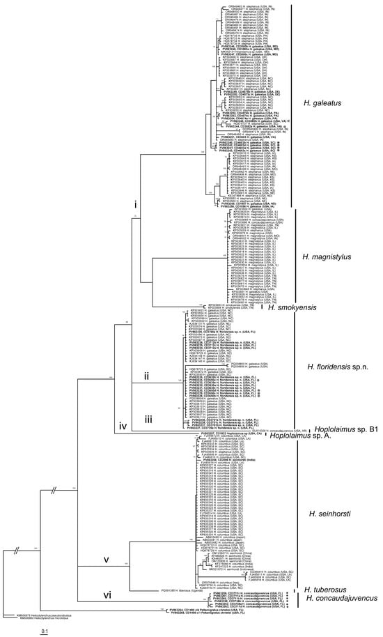 Several Hoplolaimus species showed high intraspecific variations in COI gene sequences; however, they were in variation ranges for some tylenchid nematodes found in the centers of diversification. For example, maximal intraspecific COI gene sequence diversity for G. pallida and G. rostochiensis was estimated at 20.7% and 14.2%, respectively, in the Andes, Peru, and Bolivia []; for G. mexicana, it was 9.9% in the Sierra Madre mountain systems, Mexico []; and for H. filipievi, it was 10.6% in the Irano-Anatolian region, Iran [], which are the centers of origins and diversification of these species. Based on variations in COI gene sequences for Hoplolaimus, we can suggest several centers of origins and diversification for this genus: (i) Eastern regions of North America for H. concaudajuvencus, H. floridensis sp. n., H. galeatus, H. magnistylus, and some other Hoplolaimus spp.; (ii) South and Southeast Asia for H. seinhorsti; (iii) Africa for H. pararobustus; and (iv) Southwestern regions of North America (California and Mexico) for Hoplolaimus sp. A., H. californicus, H. igualaensis, and H. maggentii Cid del Prado 1994.