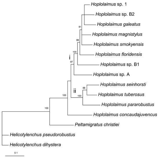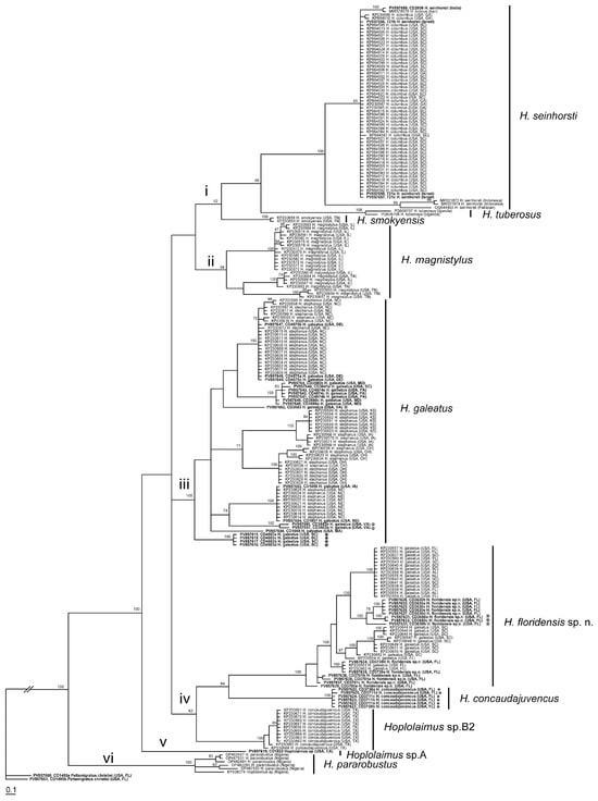 Phylogenetic relationships within Hoplolaimus species as inferred from Bayesian analysis of the D2–D3 of 28S rRNA, ITS rRNA, and COI gene sequences under the GTR + I + G model. Posterior probabilities greater than 70% are given for appropriate clades. Major clades are indicated by lowercase Roman numerals.