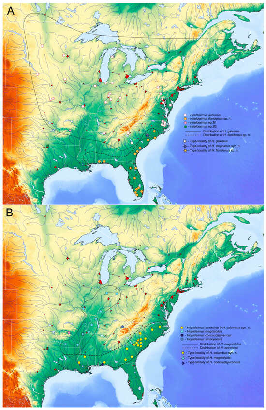 Distribution of several Hoplolaimus species in eastern regions of North America reconstructed based on published and original molecular identification of samples. (A) H. galeatus, H. floridensis sp. n., Hoplolaimus sp. B1, Hoplolaimus sp. B2; (B) H. seinhorsti, H. magnistylus, H. concaudajuvencus, H. smokyensis.