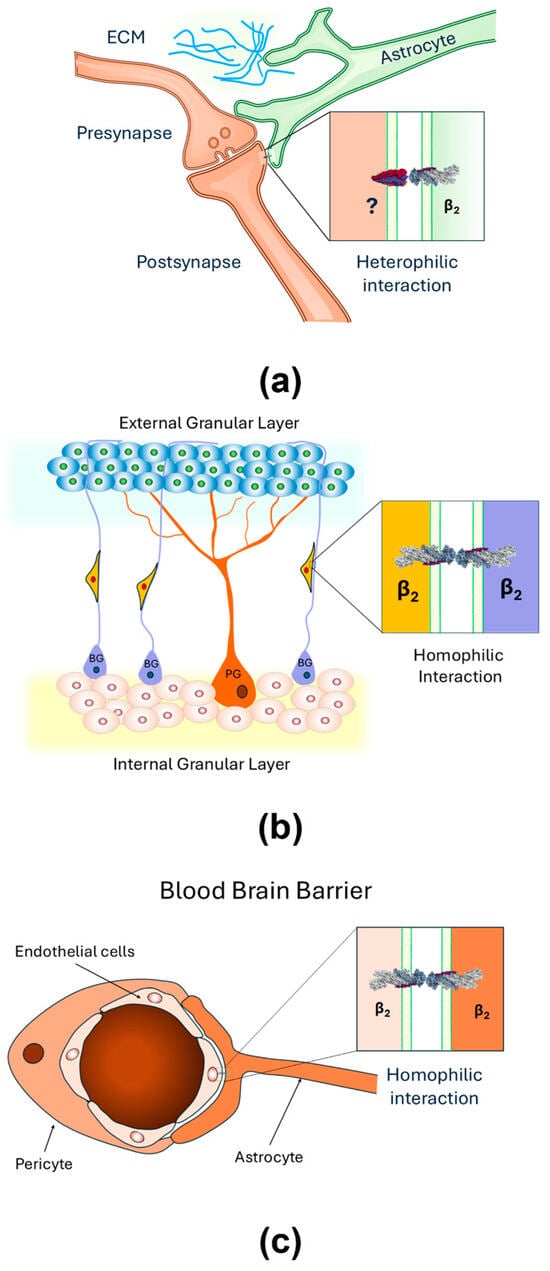 Homophilic and heterophilic interactions of AMOG/β2 are plausible at the CNS. (a) At tripartite synapses, astrocytic processes may contact neurons through heterophilic interactions between astrocytic AMOG/β2 and an unidentified neuronal partner (?); (b) AMOG/β2 may engage in homophilic interactions with cerebellar granule cells during migration; (c) AMOG/β2 may engage in homophilic interactions with endothelial cells at the blood–brain barrier.