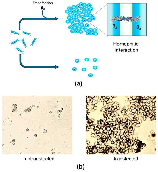 AMOG/β2 transfected in CHO fibroblasts facilitates aggregation through β2-β2 interactions. (a) A simple illustration of the aggregation assay of transfected or untransfected CHO cells. (b) Images taken by light microscopy of dispersed cells of untransfected CHO fibroblast (left) and big aggregates of AMOG/β2 transfected CHO cells (right). Adapted from Roldán et al. (2022) [].