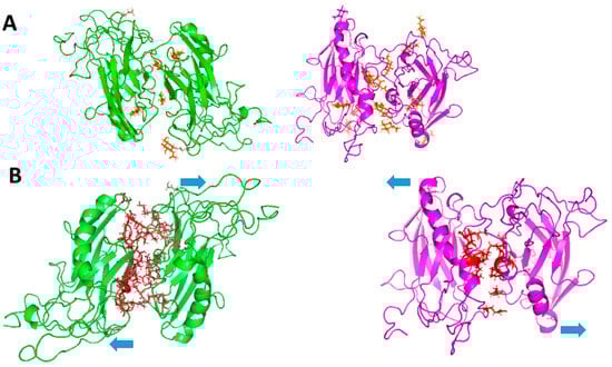 Three-dimensional models of trans-dimers of β1 and β2 subunits of human Na+/K+-ATPase. (A) N-Glycosylation sites of β1 and β2 dimers. N-Glycosylations are depicted in orange. (B) Protein–protein interfaces of β1 and β2 trans-dimers. The protein interface is highlighted in red in both models. The 3D models of β1 and β2 are shown in green and magenta, respectively. Blue arrows denote the orientations of the two β-subunits comprising the dimer, in trans. Modified from Ramírez-Salinas et al. [].