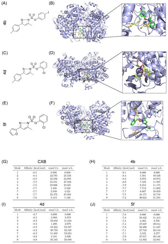 Molecular docking simulations demonstrated that compounds 4b (Figure 1A), 4d (Figure 1C), and 5f (Figure 1E) effectively bind to the active site of COX-2 [], yielding optimal 3D docking conformations (Figure 1B,D,F). The lowest binding energies for compounds 4b, 4d, and 5f were −9.1, −8.7, and −7.8 kcal/mol, respectively (Figure 1H–J), compared to −8.5 kcal/mol for CXB (Figure 1G).