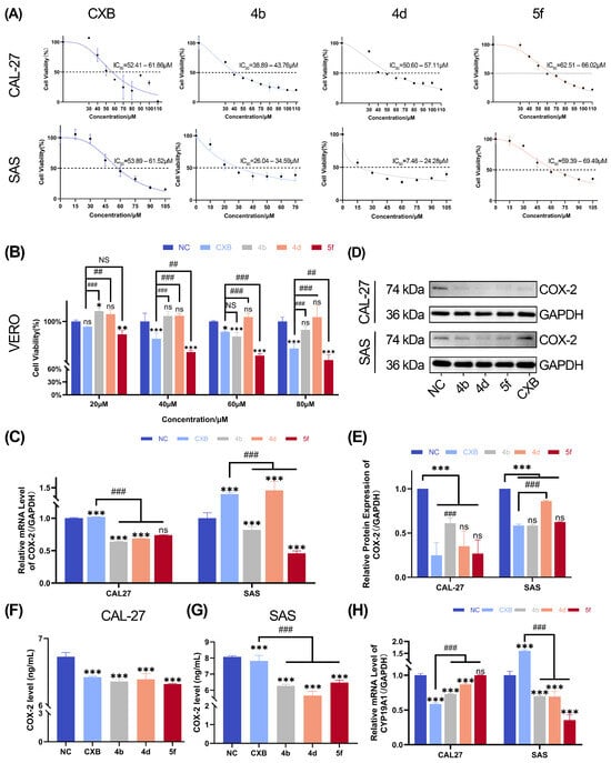 Cytotoxicity and COX-2 inhibition by CXB and derivatives in OSCC cell lines. (A) CCK-8 assay showing proliferation inhibition and values in CAL-27 and SAS cells treated with CXB, 4b, 4d, and 5f for 24 h. (B) CCK-8 assay assessing cytotoxicity of working concentrations of CXB, 4b, 4d, and 5f in VERO cells. (C) RT-qPCR analysis of COX-2 mRNA levels in CAL-27 (left) and SAS (right) cells after 24 h-treatment. Expression of COX-2 protein in CAL-27 and SAS cells was determined by Western blot. (D) Representative Western blot images. (E) Quantitative analysis of the results. COX-2 levels in CAL-27 (F) and SAS cells (G) were measured with ELISA. (H) RT-qPCR analysis of CYP19A1 mRNA levels in CAL-27 (left) and SAS (right) cells post-treatment. Data are shown as mean and SD of triplicates (mean ± SD). (* p < 0.05, ** p < 0.01, *** p < 0.001; ns: no significance vs. NC. ## p < 0.01, ### p < 0.001; NS: no significance vs. CXB).