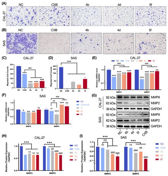 Compounds 4b, 4d, and 5f inhibit OSCC cell migration. (A) Transwell migration assay in CAL-27 cells treated with compounds 4b, 4d, and 5f, and the quantitative analysis of the results. (B) Transwell migration assay in SAS cells treated with compounds 4b, 4d, and 5f, and the quantitative analysis of the results. (C) The quantitative analysis of the Transwell migration assay results in CAL-27 cells. (D) The quantitative analysis of the Transwell migration assay results in SAS cells. (E,F) mRNA expression levels of MMP2 and MMP9 in CAL-27 (E) and SAS (F) cells by RT-qPCR. The protein expressions were assessed by Western blot in CAL-27 cells. Representative Western blot images (G) and quantitative analysis of the results (H). The protein expression was assessed by Western blot in SAS cells. Representative Western blot images (G) and quantitative analysis of the results (I). Data are shown as mean and SD of triplicates (mean ± SD). (* p < 0.05, ** p < 0.01, *** p < 0.001; ns: no significance vs. NC. ## p < 0.01, ### p < 0.001; NS: no significance vs. CXB).
