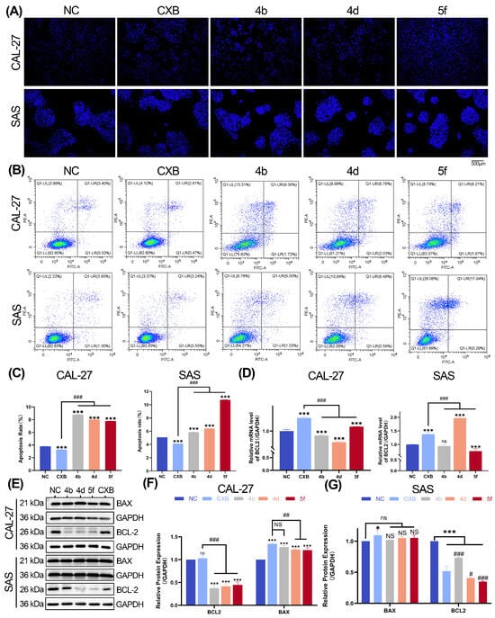 Compounds 4b, 4d, and 5f promote apoptosis in OSCC cells. (A) Hoechst 33342 staining of CAL-27 and SAS cells following treatment with CXB and the compounds. Apoptotic cells are characterized by condensed nuclei with intense staining. Schematic diagram of cell apoptosis measured with flow cytometry analysis. After treatment with CXB and compounds for 24 h, the apoptosis of CAL-27 and SAS cells was detected via Annexin V-FITC/PI staining. (B) Representative flow cytometry scatter plots. (C) The statistical results of the apoptotic rate. (D) Relative mRNA expression levels of BCL2 in CAL-27 and SAS cells by RT-qPCR. (E,F) Apoptosis-related protein expression assessed by Western blot. CAL-27 cells: Representative Western blot images (E) and quantitative analysis of the results (F). (E,G) SAS cells: Representative Western blot images (E) and quantitative analysis of the results (G). Data are shown as mean and SD of triplicates (mean ± SD). (* p < 0.05, *** p < 0.001; ns: no significance vs. NC. # p < 0.05, ## p < 0.01, ### p < 0.001; NS: no significance vs. CXB).
