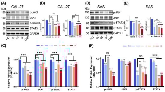 Effects of Compounds 4b, 4d, and 5f on JAK/STAT Signaling Pathway. (A–C) The protein expression was assessed by Western blot in CAL-27 cells. Representative Western blot images (A) and quantitative analysis of the results (B,C). (D–F) The protein expression was assessed by Western blot in SAS cells. Representative Western blot images (D) and quantitative analysis of the results (E,F). Data are shown as mean and SD of triplicates (mean ± SD). (* p < 0.05, ** p < 0.01, *** p < 0.001; ns: no significance vs. NC. # p < 0.05, ## p < 0.01, ### p < 0.001; NS: no significance vs. CXB).