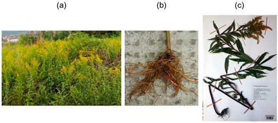 The widespread occurrence of invasive Solidago gigantea Ait. (giant goldenrod) in a field near Dorog, Hungary (a), the roots of S. gigantea (b), and the deposited voucher herbarium specimen (accession number: HNHM-TRA 00027284) (c).