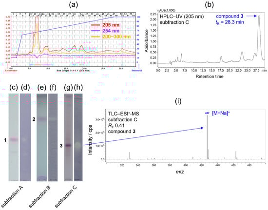 UV chromatograms at 205 nm (red), 254 nm (magenta), and 200–300 nm (yellow) (a) acquired by preparative reversed-phase (RP) flash column chromatographic separation of fraction 77–89 using a C18 column as a stationary phase with a gradient elution (blue). Semi-preparative RP-HPLC–UV chromatogram at 205 nm (b) recorded during the isolation of compound 3 (tR = 28.3 min) from subfraction C (77–89/37–40) using a C18 column as a stationary phase with an isocratic elution. TLC chromatograms (c,e,g) visualized after derivatization with vanillin–sulfuric acid reagent (c,e) or p-anisaldehyde–sulfuric acid reagent (g), and TLC–DB bioautograms (d,f,h) obtained by a B. subtilis antibacterial assay of subfractions A (26–27/59–67/22–29), B ((26–27/32–39/23–26 + 26–27/40–48/39–67)/20–21), and C (77–89/37–40), containing compounds 1 (RF 0.47), 2 (RF 0.70), and 3 (RF 0.41), respectively. TLC–ESI+-MS spectrum of compound 3 (i) recorded from subfraction C (77–89/37–40) at RF 0.41 along with the assignment of the base peak (m/z 427 [M+Na]+).