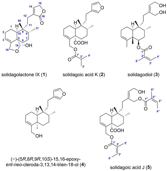 The chemical structures of the five isolated compounds (1–5) with atomic numbering (blue). Compounds 1 (solidagolactone IX, (−)-(5S*,8R*,9R*,10S*,19R*)-18,19-epoxy-19-hydroxy-cleroda-3,13-dien-16,15-olide), 2 (solidagoic acid K, (−)-(5S*,8R*,9R*,10S*)-15,16-epoxy-18-isobutyryloxy-cleroda-3,13,14-trien-19-oic acid), and 3 (solidagodiol, (−)-(5S*,6R*,8R*,9R*,10S*,13Z)-6-angeloyloxy-cleroda-3,13-dien-15,16-diol) are previously undescribed, whereas compounds 4 ((−)-(5R,8R,9R,10S)-15,16-epoxy-ent-neo-cleroda-3,13,14-trien-18-ol) and 5 (solidagoic acid J, (5S*,8R*,9R*,10S*,13Z)-16,18-diangeloyloxy-15-hydroxy-cleroda-3,13-dien-19-oic acid) are known clerodane diterpenoids.