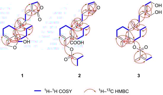 Selected 1H–1H COSY (blue) and 1H–13C HMBC (red) correlations of the three previously undescribed compounds (1–3).