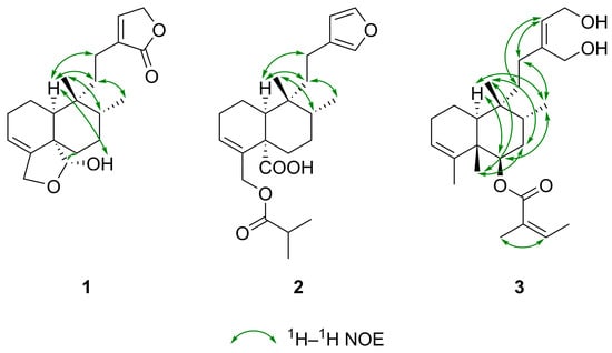 Key 1H–1H NOE correlations (green) observed in the 1H–1H ROESY spectra of the three previously undescribed compounds (1–3).