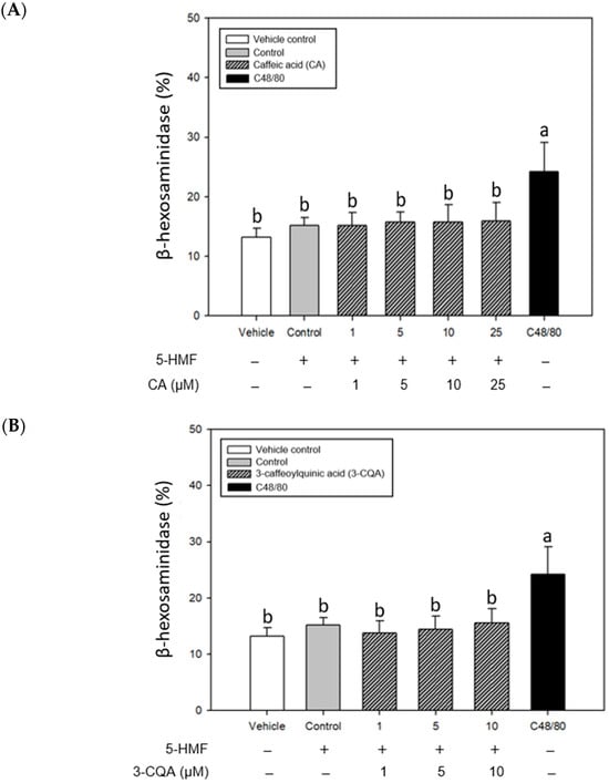Figure 4 shows the effects of CA, 3-CQA, and 5-CQA treatments on the release of β-hexosaminidase in the mast cells stimulated with 5-HMF. The results showed that the release of β-hexosaminidase in the control group tended to increase compared with the vehicle control, but there was no statistically significant difference. A C48/80 treatment alone was selected for comparison in the experiment. The stimulatory effect on the mast cell degranulation was significantly higher (p < 0.05) than that of 5-HMF. Unfortunately, adding CA, 3-CQA, and 5-CQA could not considerably affect (p > 0.05) the percentage of β-hexosaminidase release in this 5-HMF-sensitized experiment model.