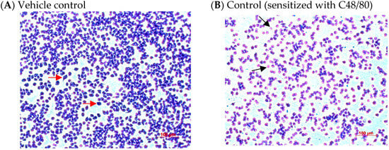 The experiment was carried out with the P815 mast cell line. The major information of Research Resource Identifier (RRID) concerning the mast cell line is provided as follows: https://catalog.bcrc.firdi.org.tw/BcrcContent?bid=60178&rowid=1 (accessed on 8 September 2021). P815 cell line is a mast cell line that was originally isolated from a tumor with a disease of mastocytoma (mast cell). P815 cell is an animal cell from Mus musculus (DBA/2 mouse) mast cell; mastocytoma; mouse mastocytoma []. It can be applied in immunological research with 3D cell culture. The cell type of the P815 cell line is a mast cell that can be classified as Eukaryota, Animalia, Metazoa, Chordata, Vertebrata, and Tetrapoda. The mast cell line was purchased from the Bioresource Collection and Research Center (BCRC, BCRC No. 60178) of the Food Industry Research and Development Institute (FIRDI), Hsinchu, Taiwan, https://catalog.bcrc.firdi.org.tw/BcrcContent?bid=60178&rowid=1 (accessed on 8 September 2021). The P815 mast cell line, a specific type of immune cell and mast cell, was used in the experiment to explore allergic reactions, degranulation effects, inflammation, and immunological research []. The P815 mast cell line used in the experiment was confirmed to be free of contamination by Mycoplasma.