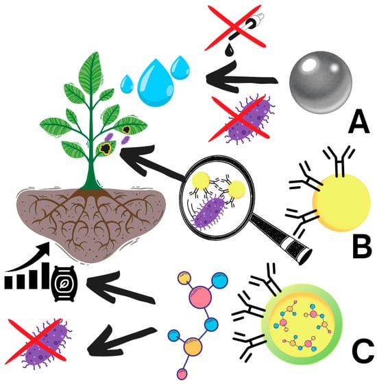 Schematic representation of nanoparticle application in agriculture. (A): Nanoparticles can be used to remove (X) water contamination, including pathogens and harmful chemicals, including dyes; (B) be used to detect important plant pathogens; (C) for the targeted delivery of chemicals to more efficiently stimulate plant growth and suppress the pathogens.