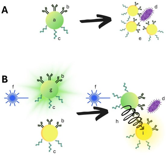 Schematic representation of nanosensors. (A) based on colorimetric biosensors: (a): non-aggregated nanoparticles are visible in visible light, and the nanoparticles can be modified with antibodies (b) or nucleic acid (c). After the addition of the antigen, the nanoparticles aggregate around the antigen (d), which causes the change of the nanoparticle’s visual color (e). (B) Quantum dots nanoparticles use fluorescent material that can be excited by blue light (f). The excited Quantum dots emit the light of a certain wavelength, when different Quantum dots differing in the excitation wavelength and the emitted light are brought into proximity by binding to one antigen (d), the energy from one QD can be non-fluorescently transmitted to another (h), bringing it to an excited state and causing the emitting of light of different wavelengths (i).