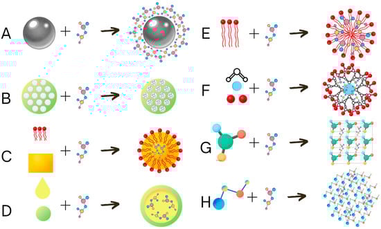 Schematic representation of nanoencapsulation types. The active substance can be delivered on the surface of metallic nanoparticles (A), inside the mesoporous silicon-based nanocarriers mesoporous (B), dissolved in solid lipid inside the solid lipid nanoparticles (C), dissolved in a liquid carrier inside the nanocapsules (D), carried inside micelles (E), carried by liquid-absorbing dendrimeric nanoparticles (F), incorporated into the crystal structure of nanocrystals (G), or trapped between the polymers of nanogels (H).