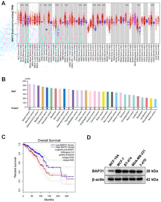 Initially, to investigate the expression level of BAP31, we conducted an analysis using the TIMER 2.0 database on the TCGA datasets. The results suggested that BAP31 was significantly upregulated in BRCA compared with in adjacent normal tissues (p < 0.001) (Figure 1A). It was further found that BAP31 was upregulated in most cancer cells, with highest expression in breast cancer cell lines (Figure 1B). In addition, Kaplan–Meier analysis revealed that the elevated BAP31 expression was associated with poorer prognosis in breast cancer (Figure 1C). Moreover, Western blot analyze indicated that the expression of BAP31 in breast cancer cell lines including MCF-7, BT-474, MDA-MB-231, and T-47D was higher than that in normal breast epithelial cells (MCF-10A) (Figure 1D). These findings showed that the BAP31 expression was significantly upregulated in breast cancer and its expression level was associated with poor prognosis.