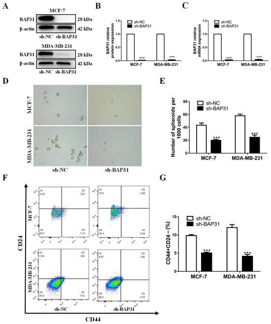 BAP31 has been demonstrated to facilitate cancer progression in various human malignancies, such as ovarian, cervical, and colorectal carcinoma. However, the potential involvement of BAP31 in breast cancer progression remains uncertain. Cancer stemness represents one of the most pivotal potential mechanisms underpinning the tumorigenesis and progression of breast cancer. This study utilized the cell lines MCF7 and MDA-MB-231 to investigate the effects of BAP31 knockdown using lentiviral vectors encoding shRNA. Analysis through Western blot and quantitative real-time PCR indicated a significant depletion of BAP31 in both cell lines (Figure 2A–C). Subsequent breast cancer sphere formation assays demonstrated a notable decrease in the number of breast cancer spheres in MCF7 and MDA-MB-231 cells lacking BAP31 (Figure 2D,E). In addition, flow cytometric analysis revealed a reduction in the proportion of CD44+CD24− cells subsequent to BAP31 knockdown (Figure 2F,G). These findings suggest that BAP31 may play a role in the regulation of tumorigenesis and stemness in breast cancer cells.