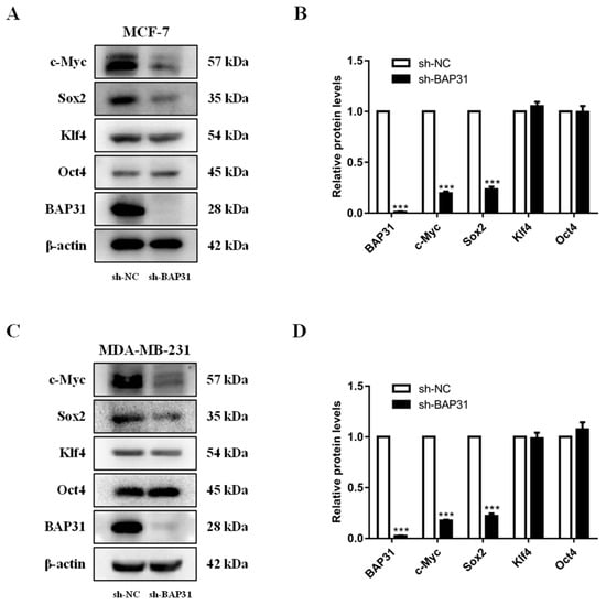 The relationship of BAP31 with core stemness factors. (A,B) Western blot analysis of BAP31, c-Myc, Sox2, Klf4, and Oct4 were performed on the lysates of sh-NC, sh-BAP31 in MCF-7 cells. (C,D) Western blot analysis of BAP31, c-Myc, Sox2, Klf4, and Oct4 were performed on the lysates of sh-NC, sh-BAP31 in MDA-MB-231 cells. N = 3. *** p < 0.001.