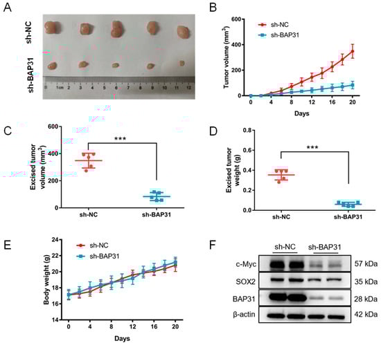 To assess the functionality of BAP31 in vivo, we established stable BAP31 knockdown MDA-MB-231 cells, which were subsequently implanted subcutaneously into BALB/c nude mice. Tumor volume and weight were then quantified in the xenograft mouse models. Our results, depicted in Figure 4A,B, demonstrate that the knockdown of BAP31 effectively inhibited tumor growth and size compared to the control group (sh-NC). Following the excision of tumor tissues, calculations of tumor volumes and weights revealed a significant decrease in both parameters in the sh-BAP31 group compared to the sh-NC group (Figure 4C,D). As illustrated in Figure 4E, the fluctuations in body weight in the sh-BAP31 group were comparable to those observed in the control group. Consistent with the findings of the in vitro cell-based study, the attenuation of stemness induced by BAP31 knockdown was evident in tumor tissues. The protein expression levels of SOX2 and c-Myc were significantly reduced in the sh-BAP31 group compared to the sh-NC group (Figure 4F). These results indicate that the suppression of BAP31 inhibits breast cancer tumorigenesis and stemness in an in vivo setting.