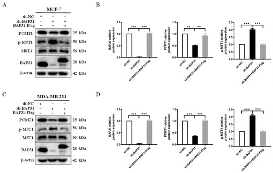 Restoration of BAP31 protein increases the expression of PCMT1 and decreases p-MST1 protein. (A,C) Western blot analysis of BAP31, PCMT1, and p-MST1 was performed in MCF-7 and MDA-MB-231 cells, respectively. (B,D) Relative content analysis of BAP31, PCMT1, and p-MST1 proteins in MCF-7 and MDA-MB-231 cells, respectively. N = 3. ** p < 0.01, *** p < 0.001.